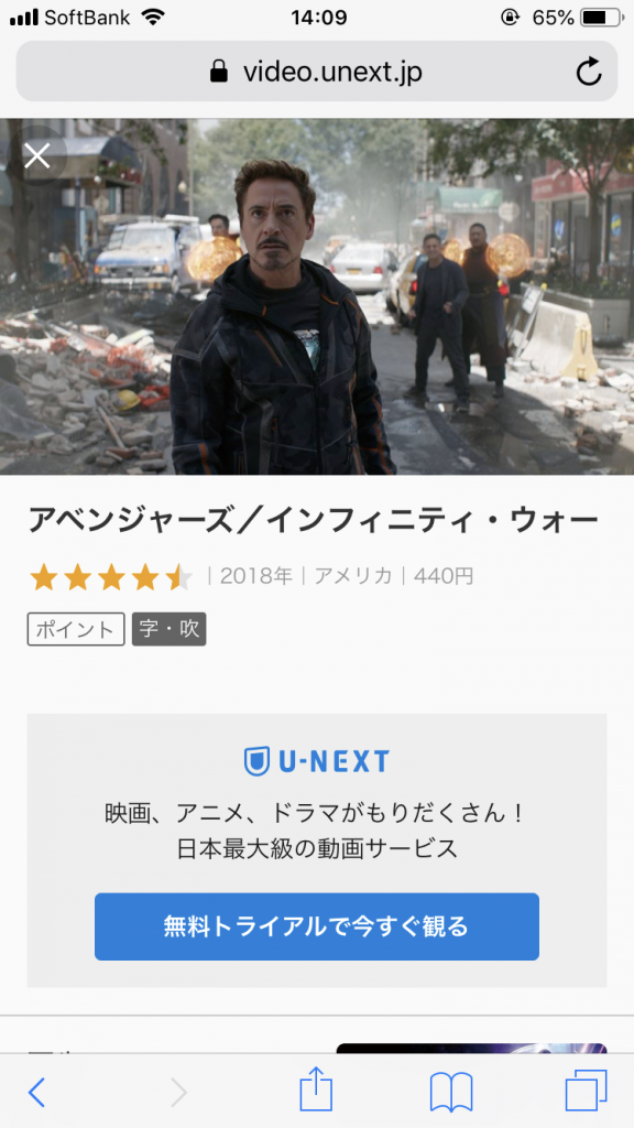 U-NEXTは、初回登録だと無料ポイントをもらえます。インフィニティ・ウォーは基本的に個別課金される作品なので、こうした無料ポイントを使って観るのも一つの手。例えばU-NEXTの無料ポイントは600なので、インフィニティ・ウォーをタダで観られます。