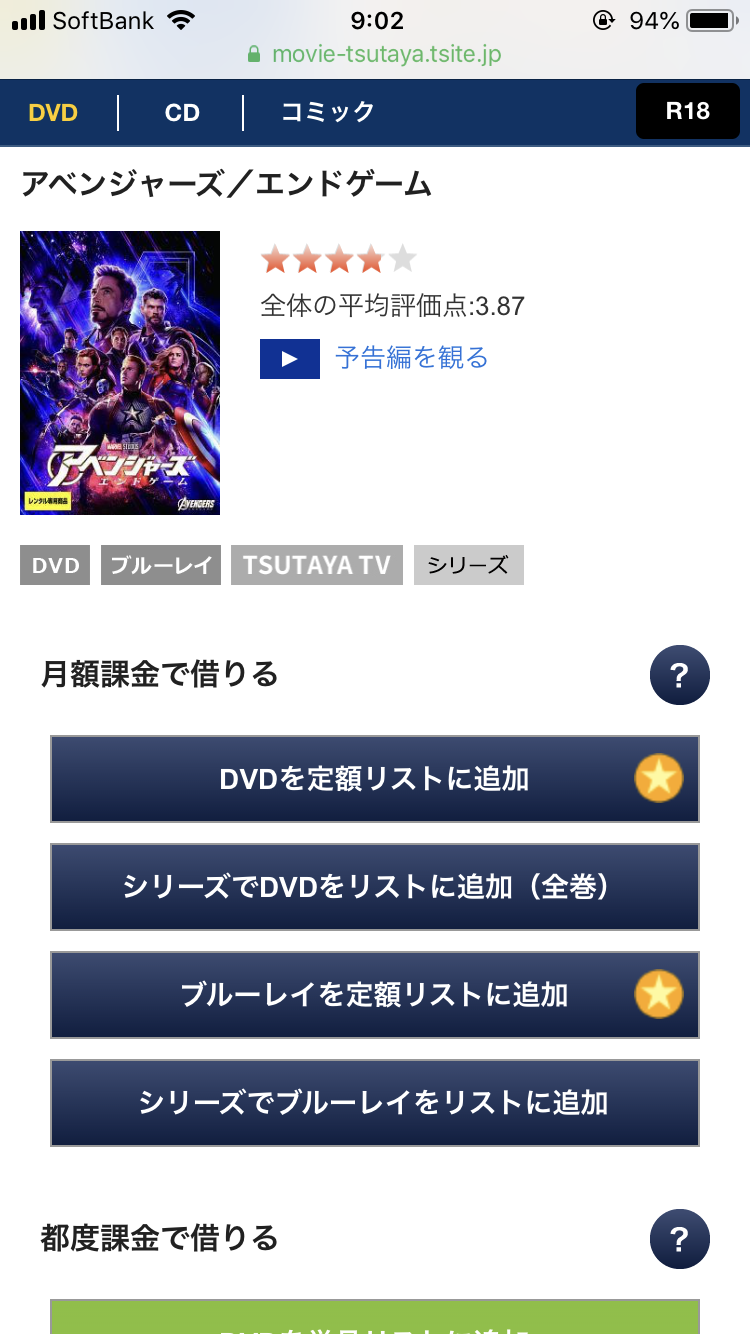 配信でも見れますが、TSUTAYAを使うならDISCASのDVD宅配を使うのがお得です。月8枚コースでも、旧作DVDは全て借り放題になっているんです。MCUはエンドゲーム以外は全部旧作なので、借り放題だからかなりお得に観られます。
