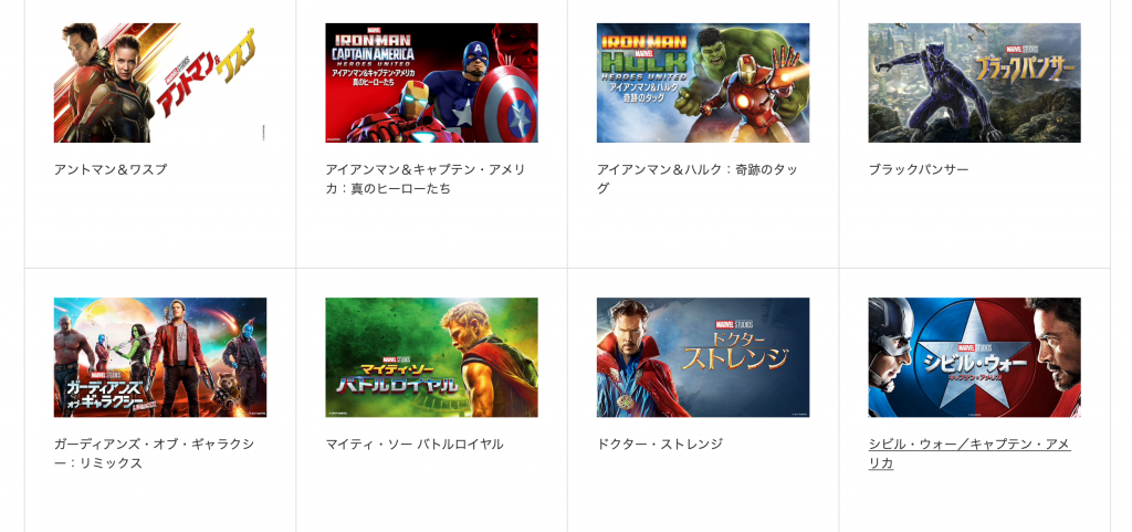マーベルと謳いつつ、基本的にはMCU関連作のみ。アイアンマンの1作目とハルク、スパイダーマンが抜けている以外は全部観られます。ただ、キャプテン・マーベルとエンドゲームは未配信。新しい作品は配信が遅いのが欠点なんです。