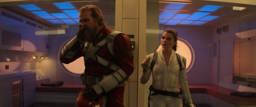 ⒸMarvel Studios 2021タスクマスターたちがメリーナの住処を襲いました。4人は、空に浮かぶレッドルームに連行されてしまいます。ドレイコフはメリーナに、ナターシャに実験中の薬品を投与しアベンジャーズを操ることを指示します。
