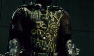 バットケイブには、どこかで見たことあるような衣装が。バットマンの相棒だったロビンのスーツです、そして、刺激的な落書きが施されています。それは「ハッハッハ、ジョークのお返しだよ、バットマン(Ha Ha Ha. Joke’s on you, Batman.)」と、ジョーカーからのメッセージです。その後の作品「スーサイド・スクワッド」でも明らかになっています。