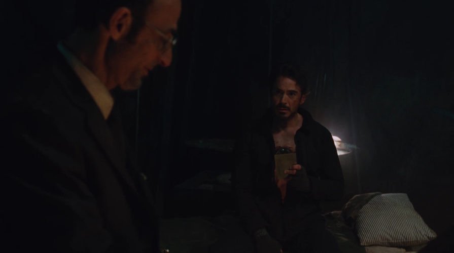 拘束先で目を覚ますと、インセン博士によって胸に電磁石が取り付けられていました。心臓の近くにある爆弾の破片をなんとか抑えるための装置で、スタークの命はあと1週間というギリギリの状況で引き止められていました。