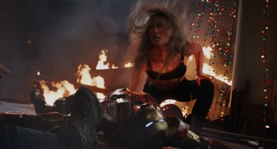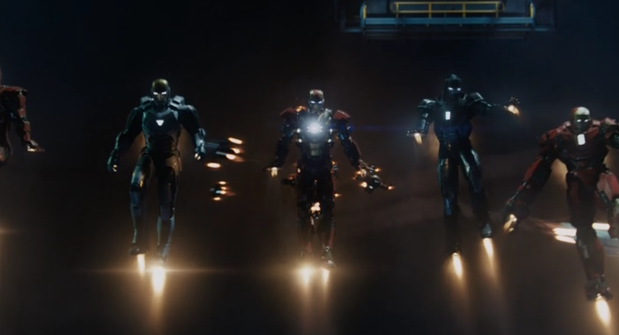 大統領の処刑場に乗り込んだスタークとローディの元に、スタークの作業場から大量のアイアンマンが飛来し戦闘を繰り広げます。ローディはなんとか大統領を助け出します。スタークはアイアンマンスーツをまとい、ペッパーを助けるべくキリアンとの最終決戦に。