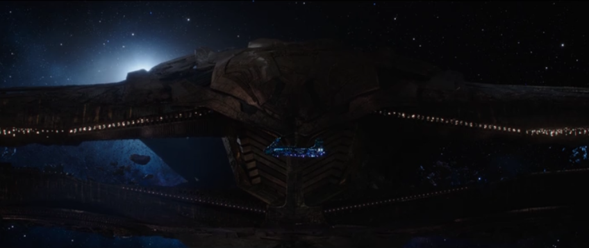 ⒸMarvel Studios 2017ソーとロキがともに手を取り合って地球へ向かうことになったアスガルド船団(恐らくこの時点で、ヴァルキリーやコーグとは別行動)。しかしその前に現れたのは、とてつもなく大きな船でした。これは最強のヴィラン・サノスの船で、このシーンは直接「アベンジャーズ3」へとつながっていきます。